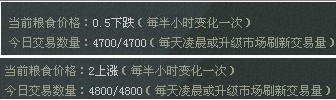 八 市场交易 市场内粮食的价格半小时刷新1次 每次从高到低 或 从低到高 的时间 在4小时左右 并不完全固定 一般来说最高点可达2.00最低点可到 0.50