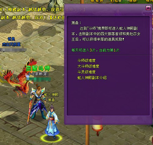(1)进入陪游斗破苍穹2后点击地图旁边『活动』→『副本』→蛇人神殿副本,点击“前往”即可自动寻路前往蛇人神殿副本NPC萧鼎处。