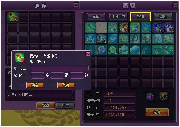 这里是特定的摆摊区,先打开自己的背包,再点击摆摊,把想出售的物品拉到左边的栏位中,再进行定价,绑定的物品不可拿来摆摊。