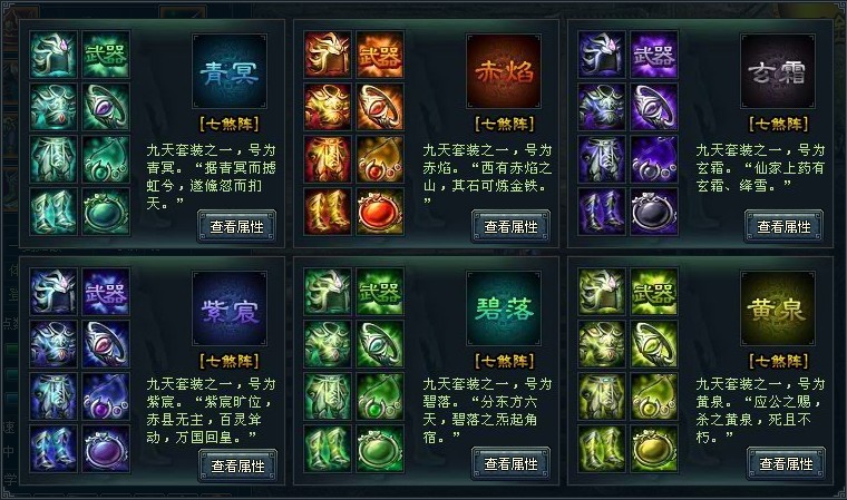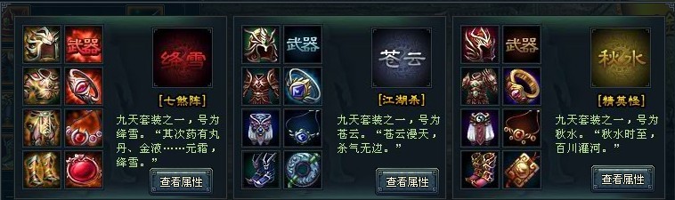 新增苍云、青冥、赤焰、玄霜、紫宸、碧落、黄泉、绛雪共八套套装,玩家点击人物界面的“查看套装”按钮可查看套装展示。